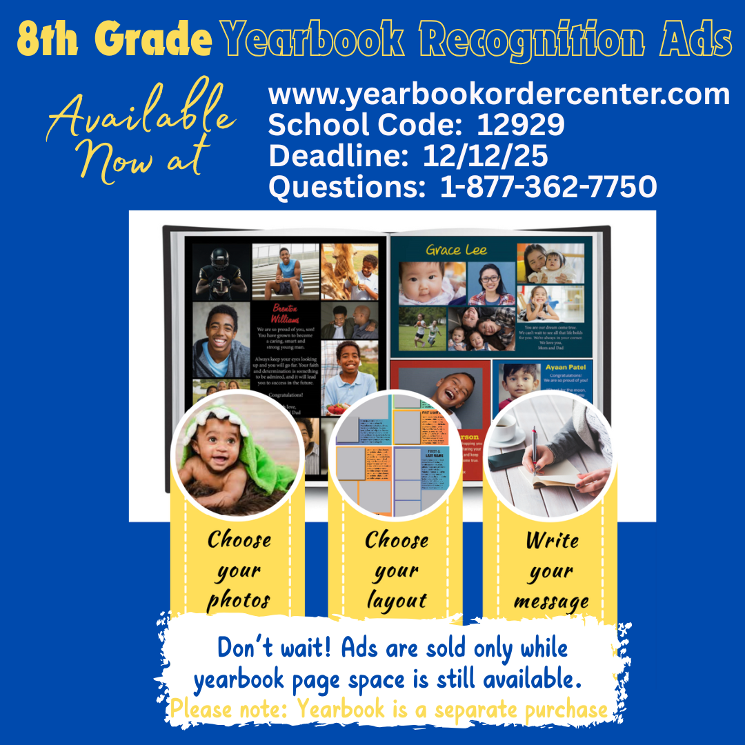 Families and friends of 8th graders may also purchase recognition ads from the same site while space lasts. We expect to reach maximum capacity soon, so please don’t wait—order early to avoid missing out!